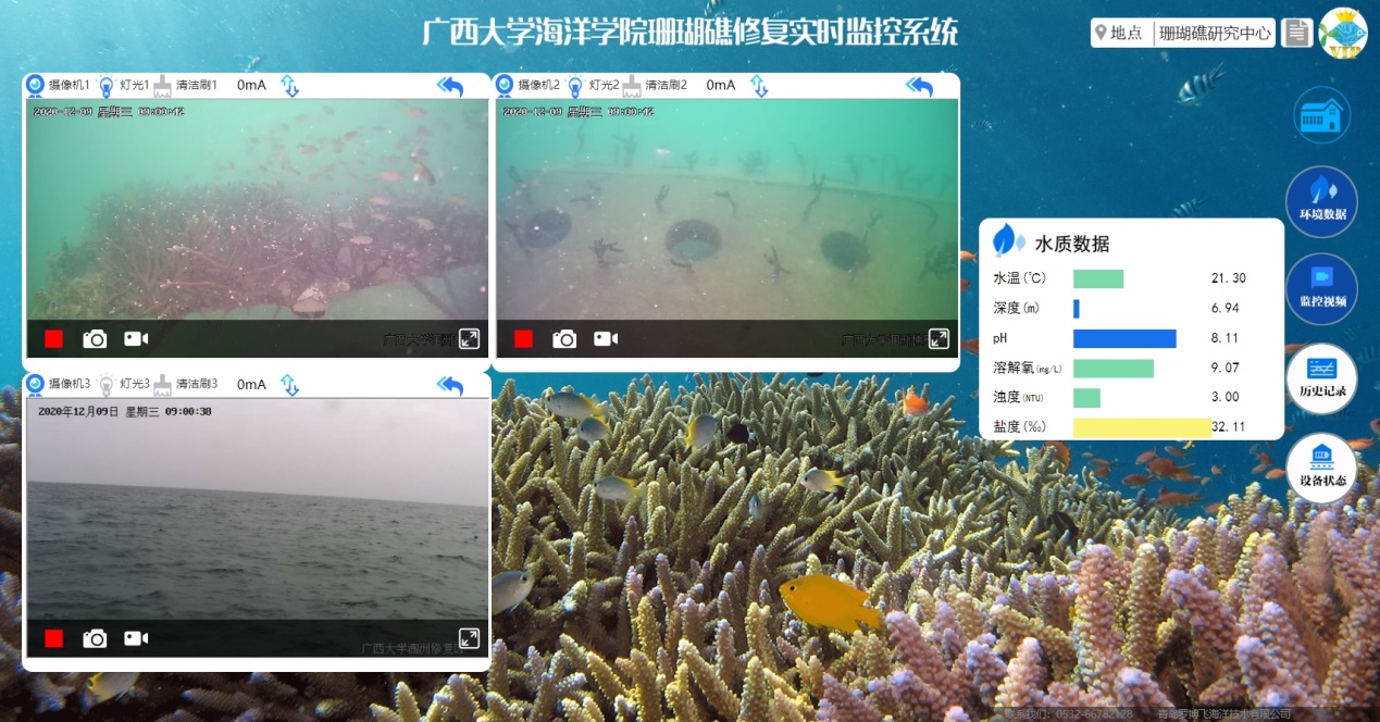 On December 23, 2020, the seabed real-time monitoring system used by the Institute of Oceanography successfully commenced operations in the Weizhou Island restoration experimental area. Real-time monitoring data is accessible via mobile phones, websites, and other platforms. This project was featured in a video news release by Xinhua News Agency: "Seabed Monitoring Helps Coral Reef Restoration" (video news).