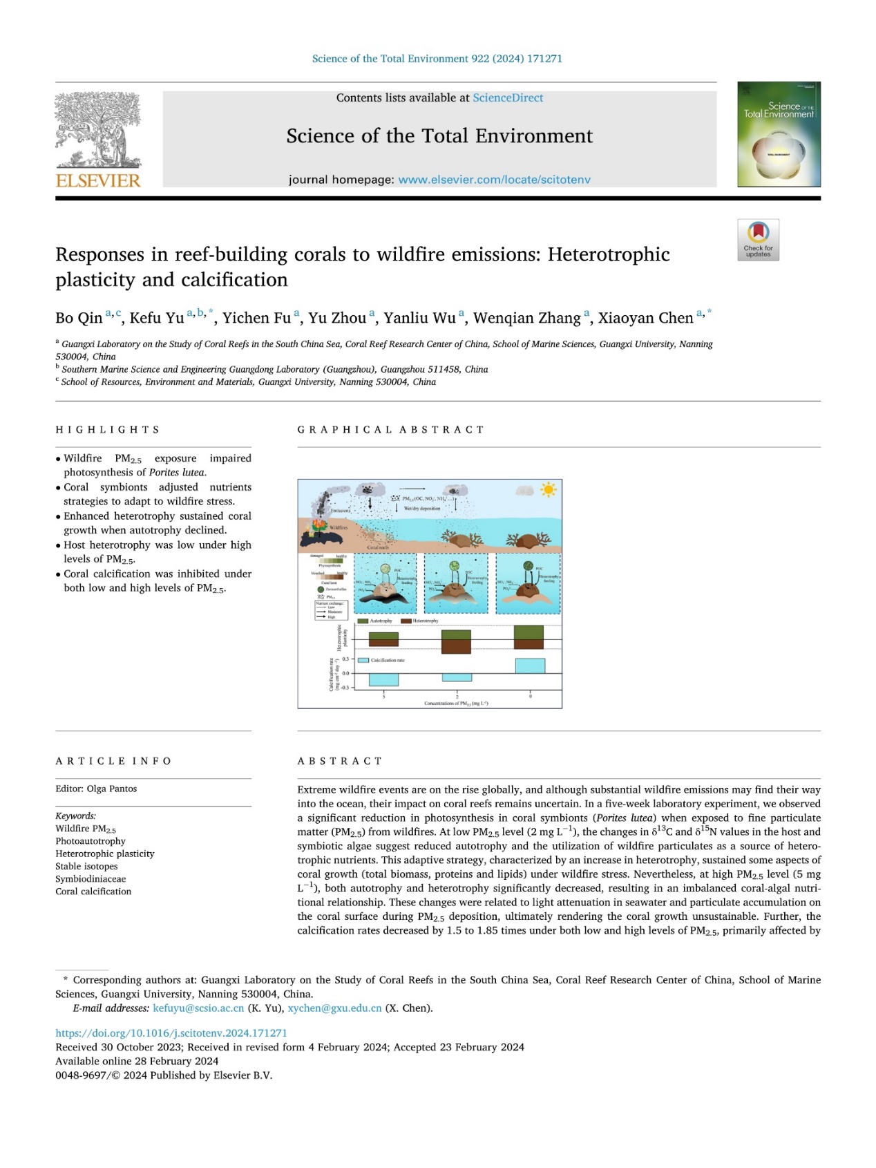Qin, B., Yu, K., Fu, Y., Zhou, Y., Wu, Y., Zhang, W., Chen, X., 2024. Responses in reef-building corals to wildfire emissions: Heterotrophic plasticity and calcification. Science of The Total Environment 922, 171271. https://doi.org/10.1016/j.scitotenv.2024.171271